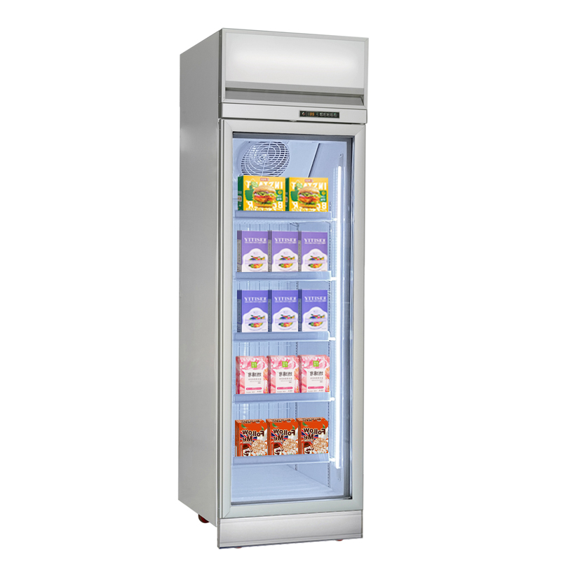 This glass display refrigerator features a fan cooling system combined with a fin-type evaporator, ensuring uniform air circulation and stable cooling performance across all shelves—even during peak usage hours.